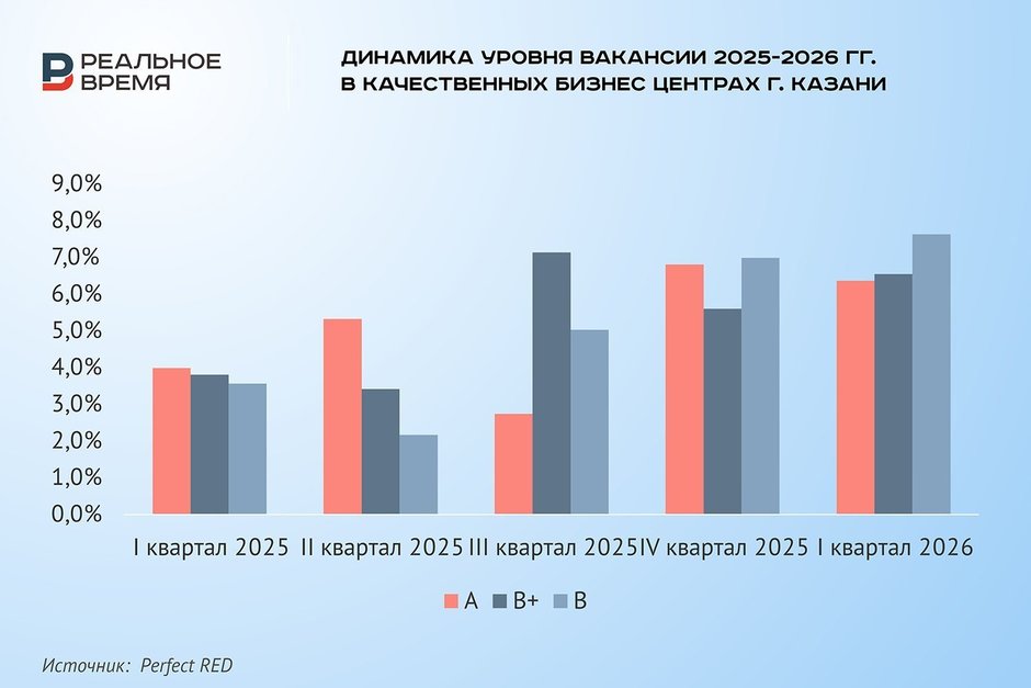 Спрос на аренду офисных помещений замер. Количество спросовых заявок Perfect RED в I квартале 2026 года снизилось на 70% в сравнении с аналогичным периодом 2025 года. При этом уровень вакансии увеличился незначительно и составил 7,2%.