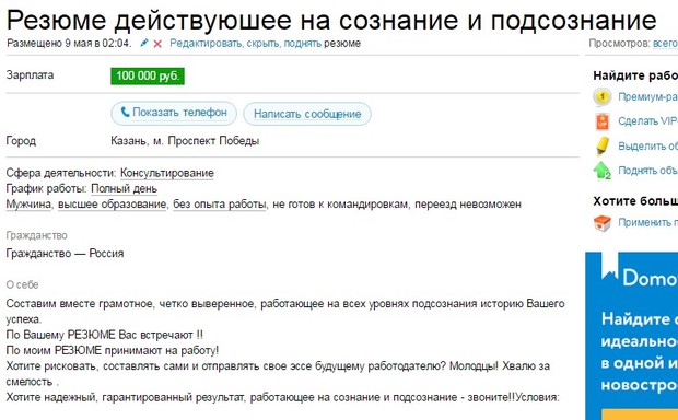 - Если же жизнь вас рассказывать о себе не научила, вам к автору следующего объявления – «Резюме действуюшее на сознание и подсознание». «По Вашему РЕЗЮМЕ Вас встречают!!! По моим РЕЗЮМЕ принимают на работу!», самоуверенно заявляет он.