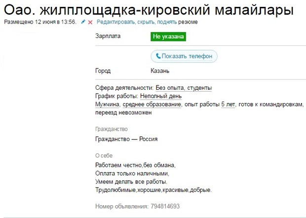 Интернет-газета «Реальное время» представляет вторую часть подборки самых забавных резюме. Кого только не встретишь в казанском сегменте сайта бесплатных объявлений. Возможно, среди сегодняшних героев нашелся даже будущий президент.