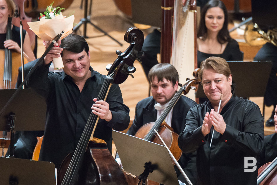 Программа началась с Концерта для контрабаса с оркестром, солировал Марат Волков, концертмейстер группы контрабасов ГСО РТ. Низкий звук контрабаса шел как будто из подсознания, он нарастал, вступали скрипки, тревожная музыка будоражила душу.