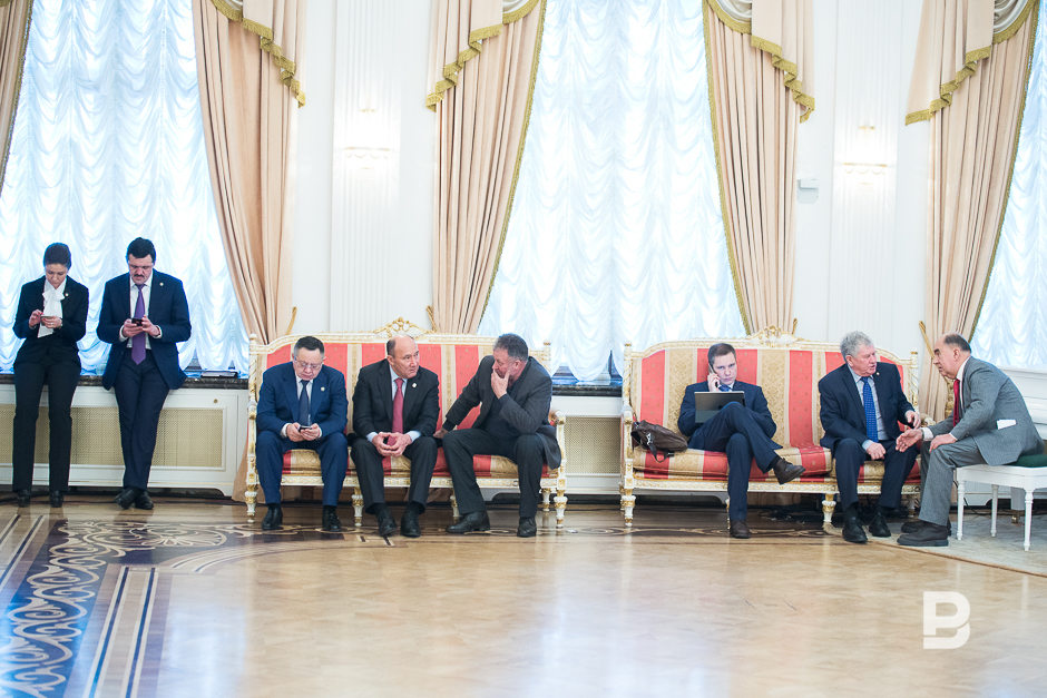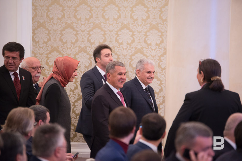 Всего он совершил 15 рукопожатий, поздоровавшись со всеми без исключения министрами татарстанского правительства. А затем первые лица поменялись «ролями»: уже премьер-министр Турции Бинали Йылдырым подводил Рустама Минниханова к каждому члену правительства Турции. Те точно так же выстроились по другой стороне зала. По наблюдениям корреспондентов, турецких высокопоставленных чиновников оказалось почти вдвое больше, чем татарстанских — почти 30 мужчин в строгих черных костюмах! Вообще в делегации было очень мало женщин. Микрофоны в зале были отключены, поэтому неизвестно, о чем в этот момент говорили политики. Но по улыбающимся лицам можно было догадаться: старались понравиться друг другу.