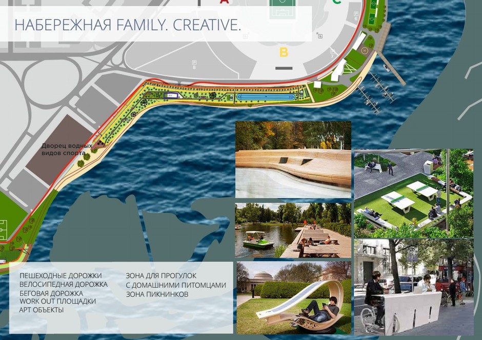 Семейная часть набережной вместит в себя пешеходные, беговые и велодорожки, воркаут-площадку, арт-объекты, место для пикников и даже зону для прогулок с домашними животными. Зона Family.Creative протянется от «Казань Арены» до Дворца водных видов спорта.