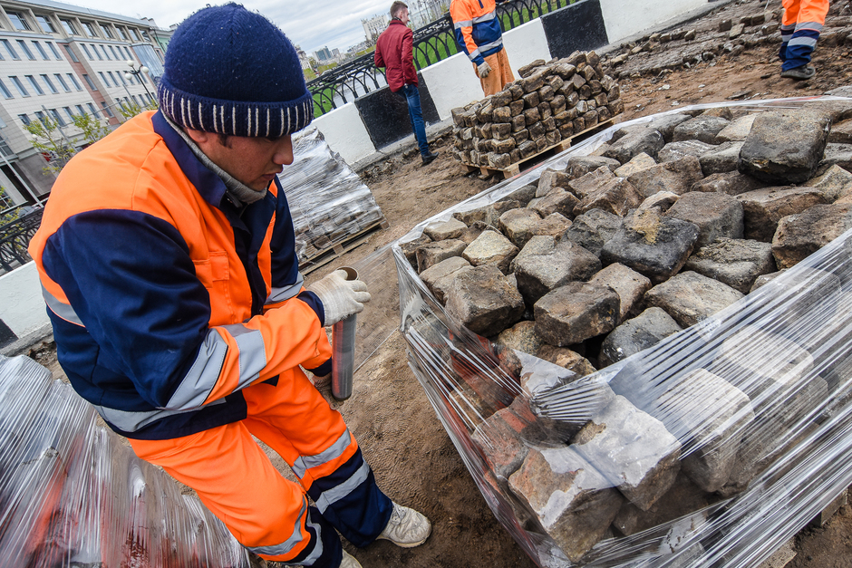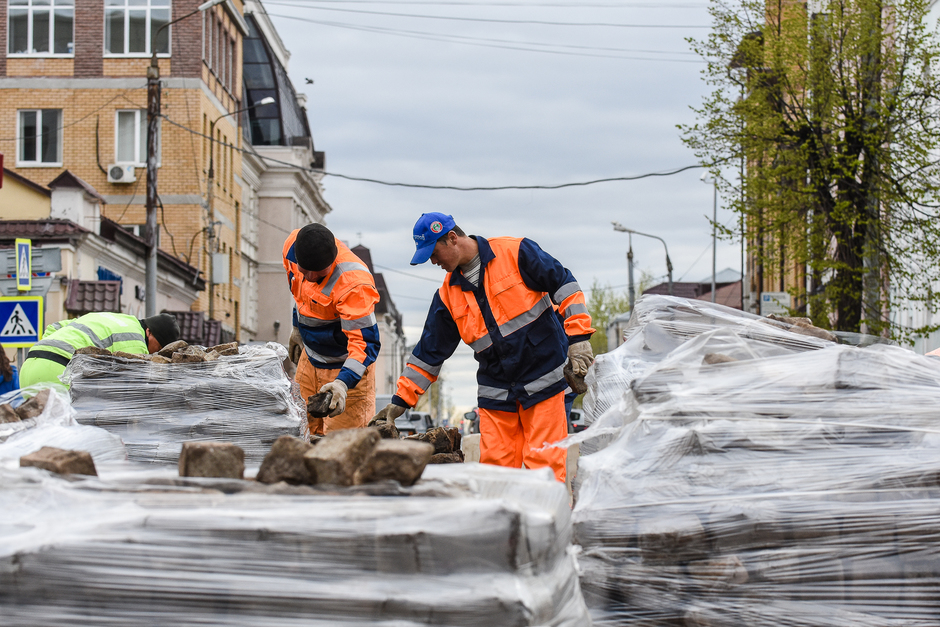 Корреспондент «Реального времени» отправился на место событий. Рабочие в форме «Каздорстроя» с помощью ломов откалывают брусчатку и складывают ее на деревянные подтоварники. На вопрос о том, что с брусчаткой будет дальше, один из рабочих говорит, что за ней приедет машина, а после они же будут ее промывать.