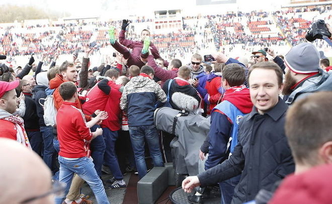 Болельщики «Спартака» не выдержали, впали в аффект и выбежали на поле — вопреки предварительной договоренности с председателем совета директоров клуба Леонидом Федуном.