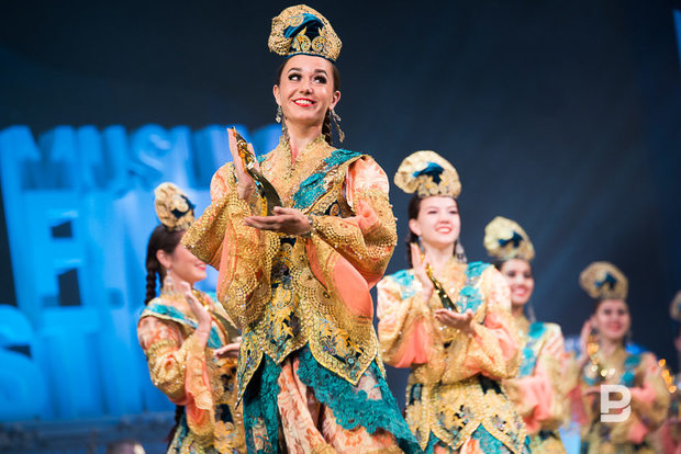 В самом начале были показаны призы фестиваля — красивые статуэтки с изображением башни Сююмбике, увитой кинолентой. С призами продефилировали девушки из Госансамбля песни и танца РТ в национальных костюмах.