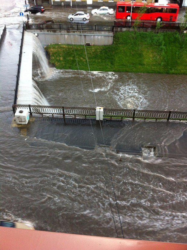 Пользователи соцсетей выкладывают снимки затопленных улиц. На мостах через протоку Булак появились настоящие водопады, улица Баумана скрылась под водой. Напомним, что неделю назад в Казани также была гроза с градом и сильнейшим ветром, несколько улиц Казани затопило, ветер сорвал часть кровли с Юнкерского училища и повалил деревья. Исполком оценил ущерб от стихии в 25 млн рублей. После дождя один из жителей Казани запустил сбор подписей за ремонт ливневой канализации. Как удалось узнать «Реальному времени», в магазине «Детский мир», расположенном в «Тандеме», протекла крыша. Сейчас магазин закрыт по техническим причинам.