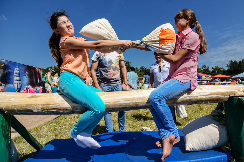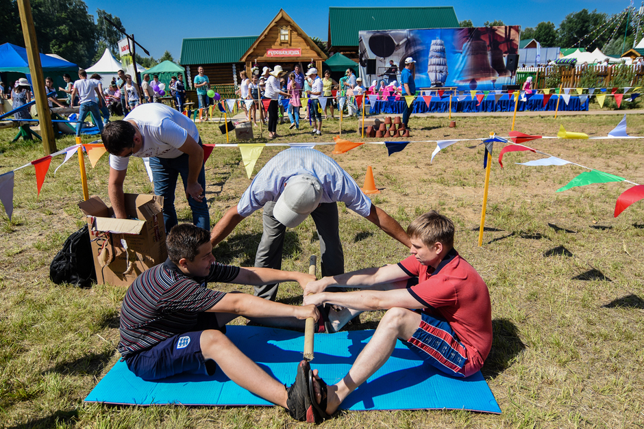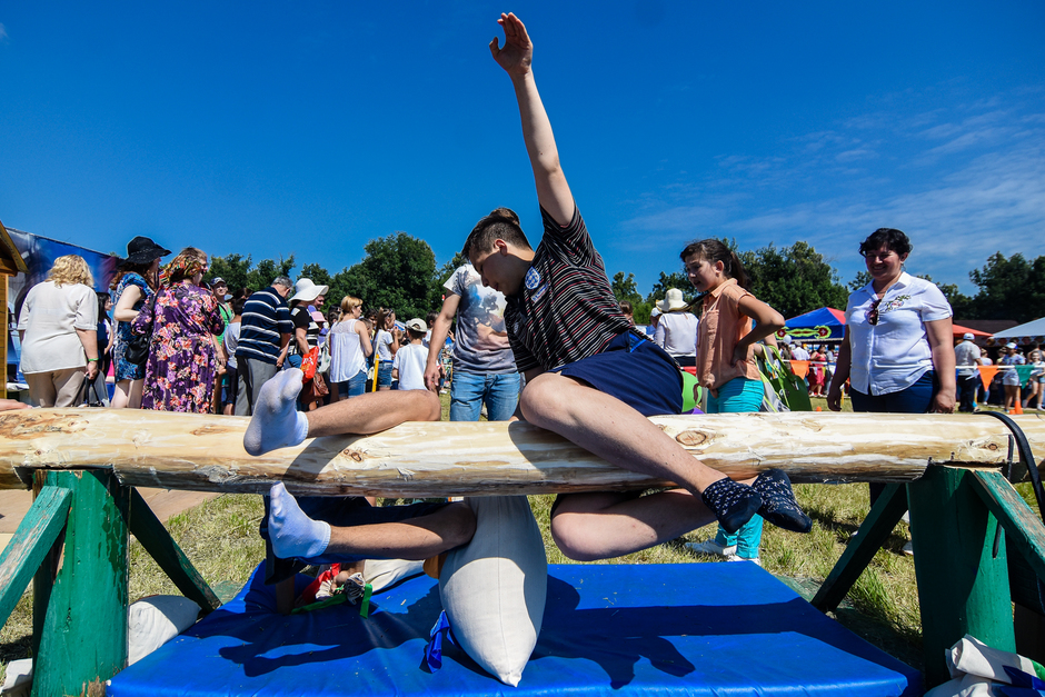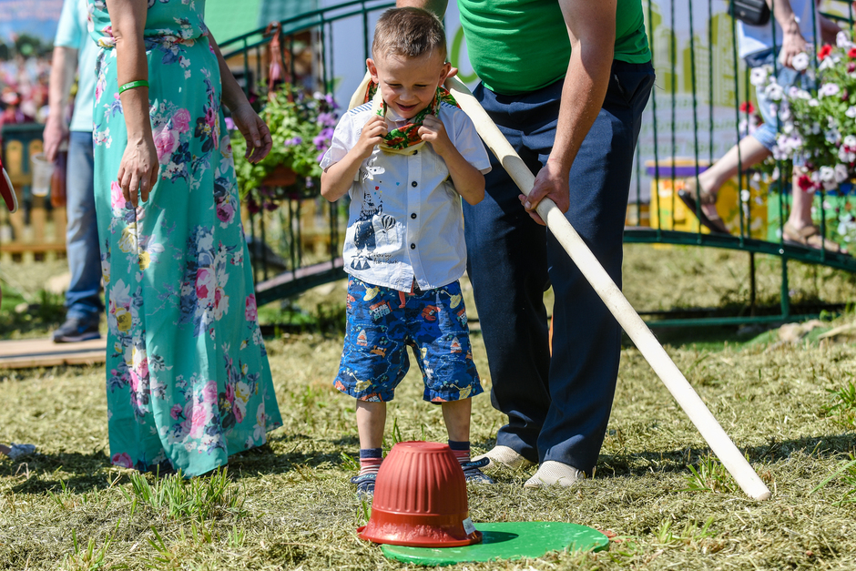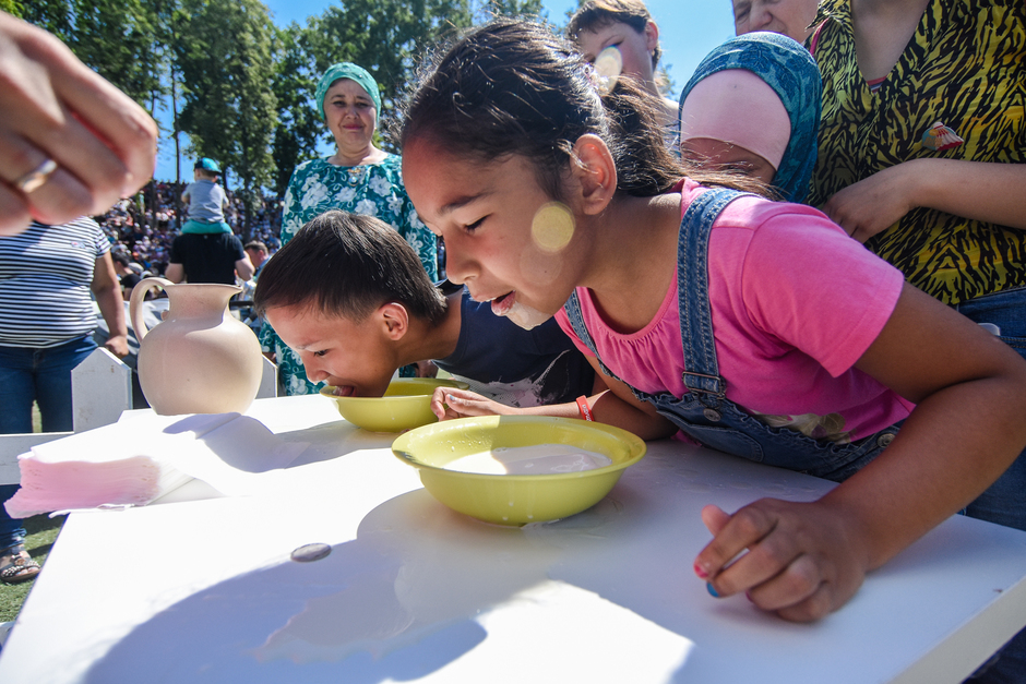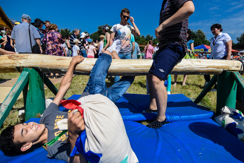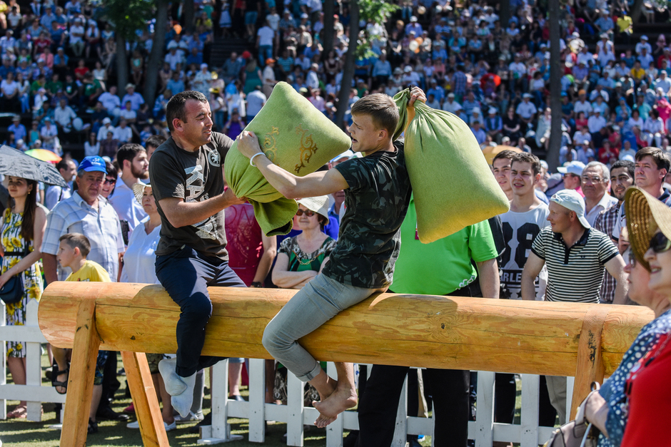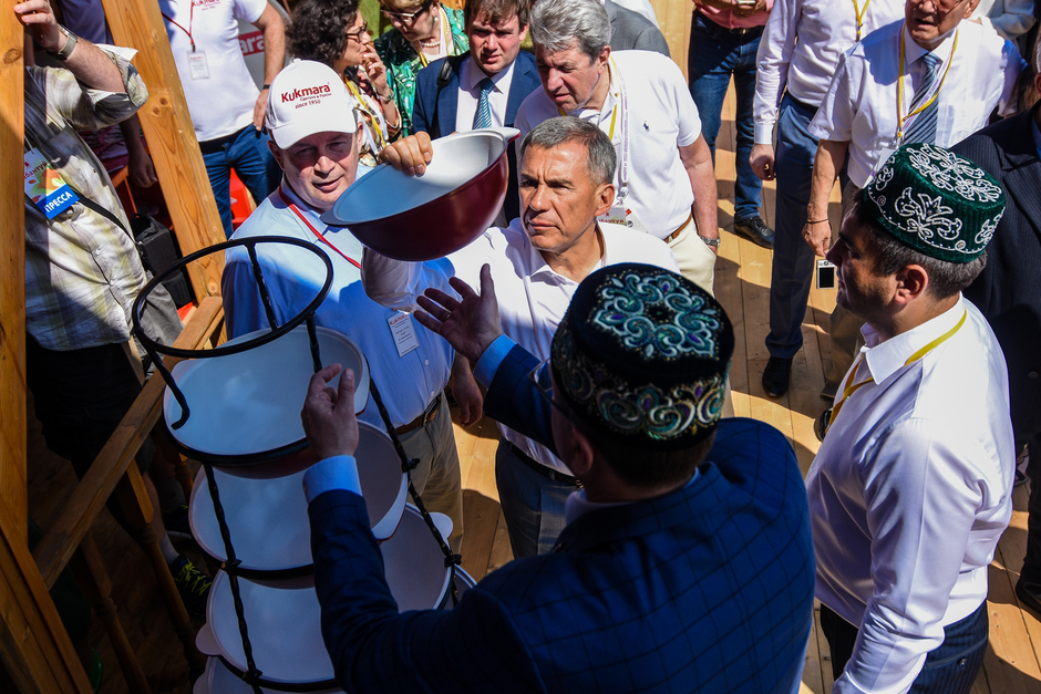 Рустам Минниханов посетил почти каждое подворье, представленное на празднике, где участвовал в разных конкурсах — кидал обруч и деревянные ложки, а также купил мешочек муки, чеканил монету, повесил полотенце, вручил призы батырам и армрестлерам, отведал ухи и мяса.