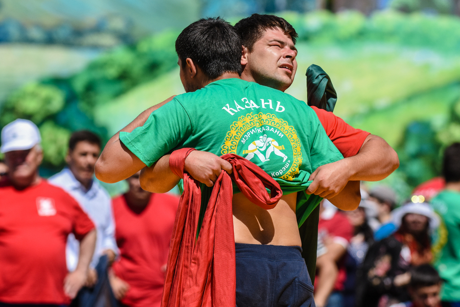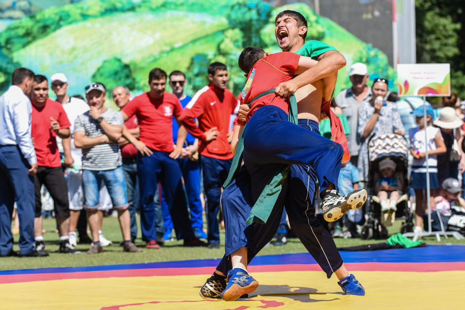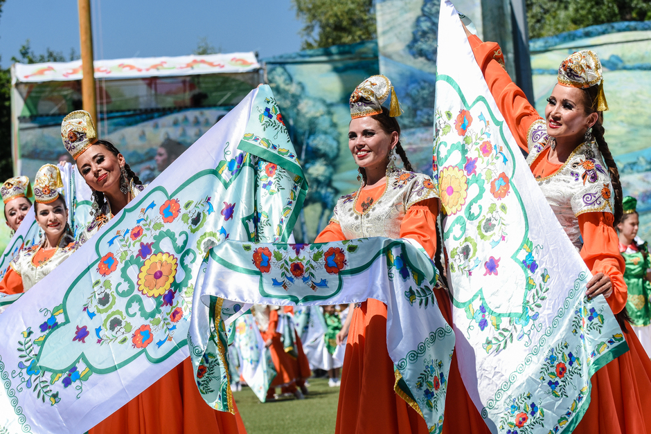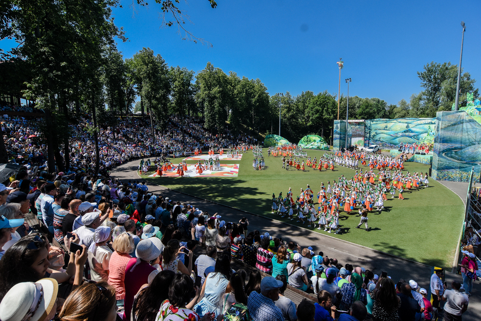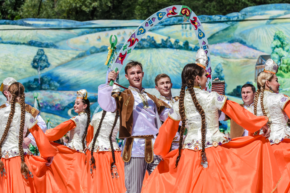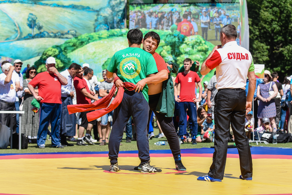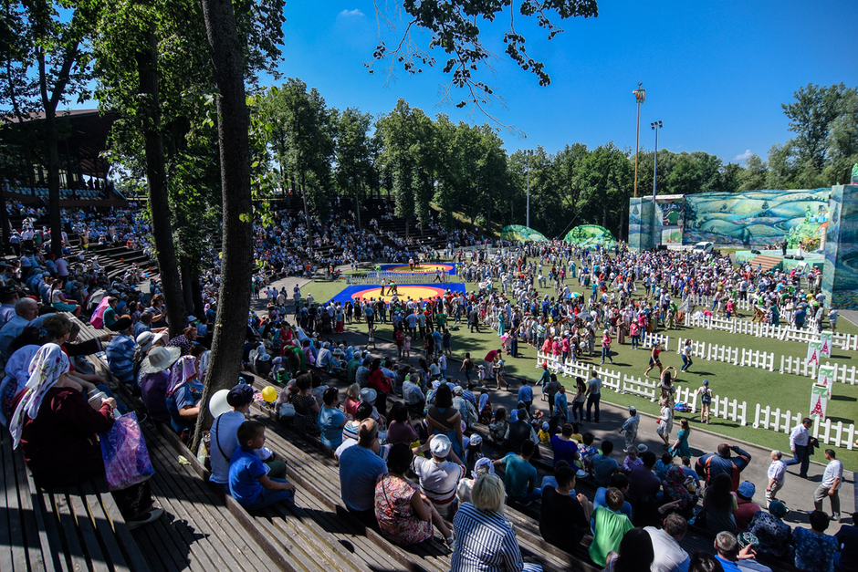 На майдане прошло масштабное театрализованное представление, затем праздничная программа продолжилась концертом с участием звезд татарской эстрады и состязаниями по национальной борьбе корэш.