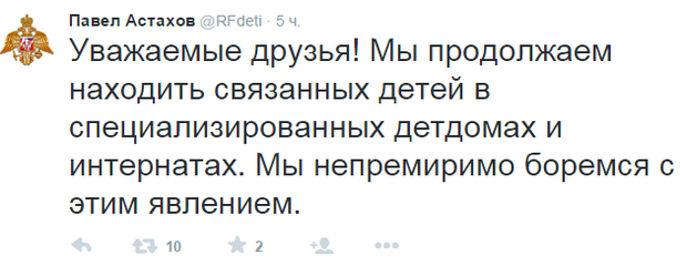 Необходимость в опросе в Twitter Астахова объяснили тем, что до сих пор в специализированных учреждениях находят связанных детей. Это сообщение было размещено гораздо раньше скандального опроса, утром 7 июля.