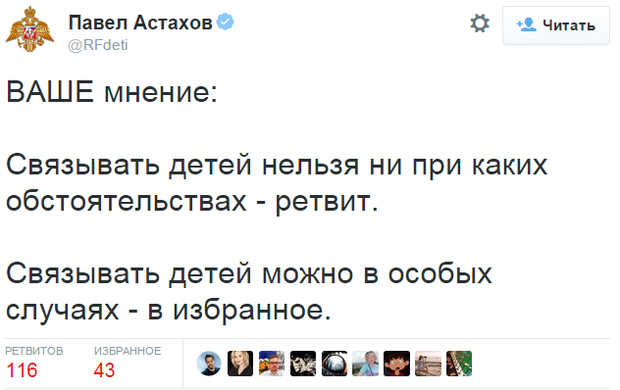 Пользователи Twitter негативно отреагировали на опрос детского омбудсмена Астахова о связывании детей