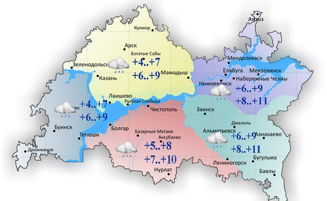 В Казани днем ожидается от +6°С до +9°С. В Набережных Челнах температура воздуха составит от +8°С до +11°С.