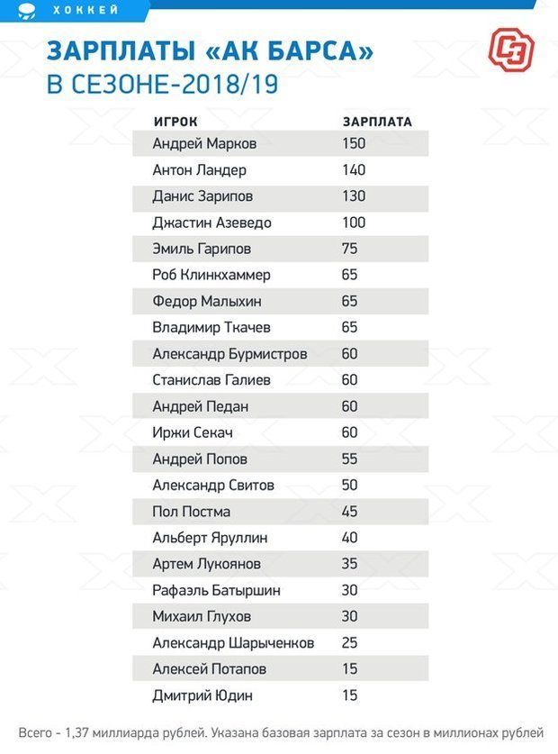 Больше всех в «Ак Барсе» за сезон 2018/2019 заработал защитник Андрей Марков, контракт которого «весил» 150 млн рублей. И это, учитывая, что защитник провел сезон значительно хуже, чем годом ранее — в чемпионский сезон.