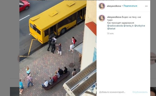 Пользователь Instagram из Белоруссии Алеся Волкова опубликовала видео, на котором видно, как двое омоновцев, задержавшие протестующего, ведут его мимо остановки и едва не запихивают в обычный пассажирский автобус.