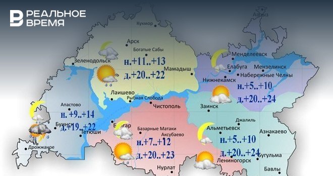 Температура воздуха днем составит от +19°С до +24°С. В Казани столбики термометров покажут 20—22 градуса тепла. В Набережных Челнах прогнозируется от +20°С до +23°С.