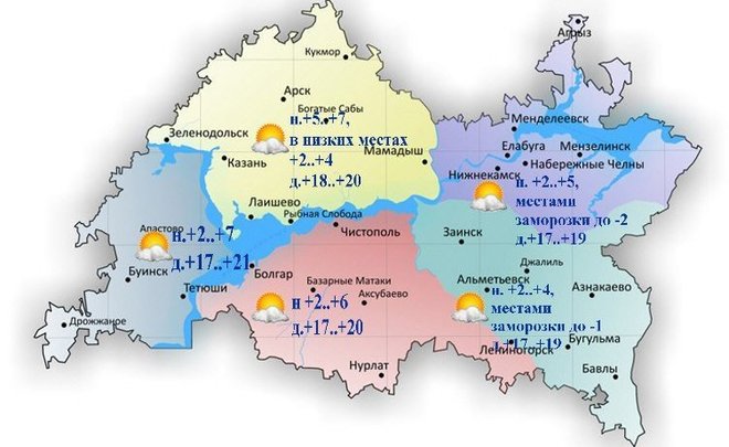Дневные температуры будут колебаться от +16°С до +21°С. В Казани метеорологи ждут от +18°С до +20°С. В Набережных Челнах воздух прогреется до 17—19 градусов тепла.