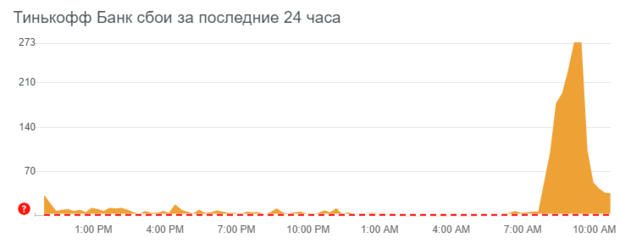Под данным сервиса Downdetector, пик перебоев у «Тинькофф» пришелся на время с 8 до 11 утра.