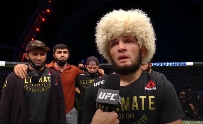 Нурмагомедов защитил пояс чемпиона UFC в легком весе. Он досрочно завершил бой во втором раунде.