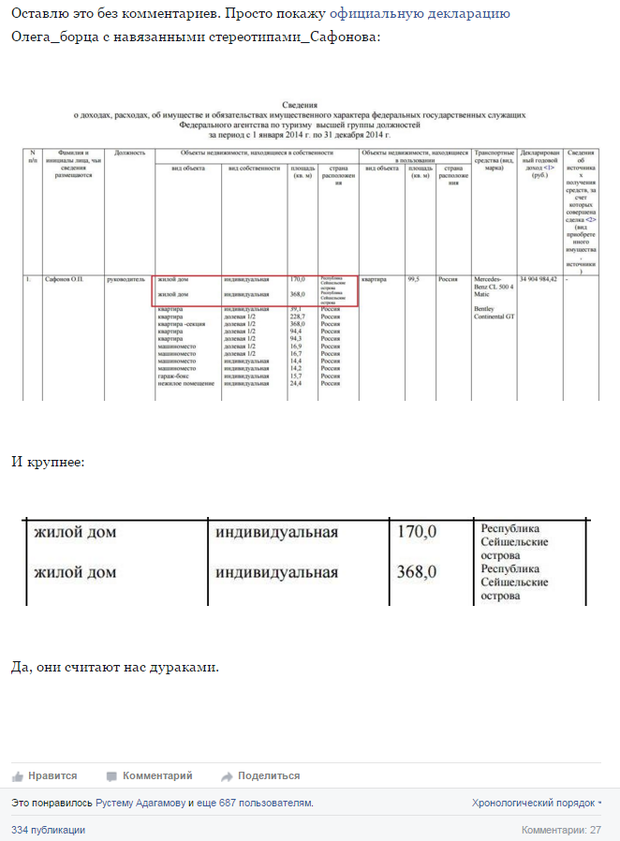 Юрист Фонда борьбы с коррупцией Любовь Соболева на своей странице в Facebook выложила скриншот декларации о доходах за 2014 год главы Ростуризма Олега Сафонова.
