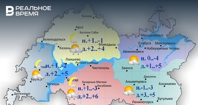 Днем температура воздуха составит от +1°С до +6°С. В Казани ожидается 2—4 градусов выше ноля, в Набережных Челнах 1—5 градусов тепла.