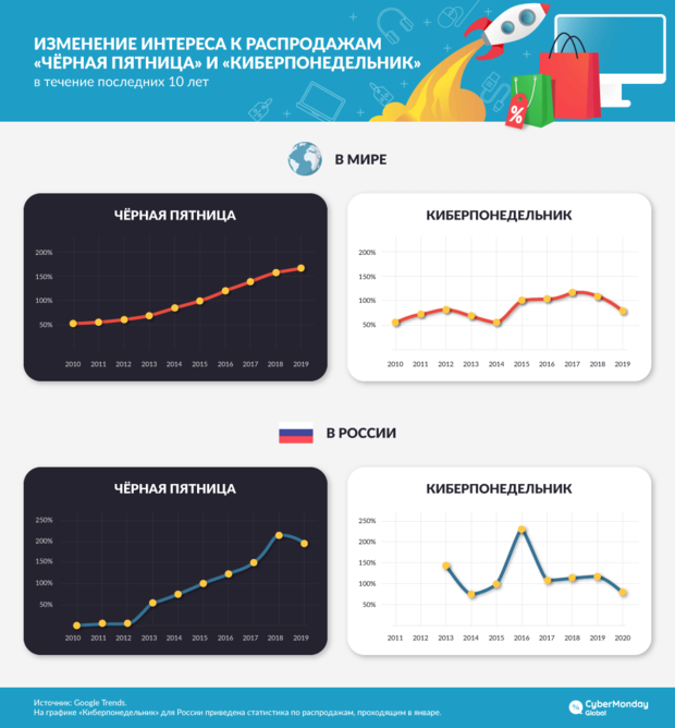 — Российские данные показывают, что пик интереса к «черной пятнице» пришелся на 2018 год, а к «киберпонедельнику» — на 2016 год. И хотя в прошедшем, 2019 году заинтересованность интернет-пользователей была не самой высокой, оба этих события притягивают внимание россиян. Однако пандемия и вызванная ею ситуация на рынке труда и в экономике могут снизить покупательскую активность, — говорится в исследовании.