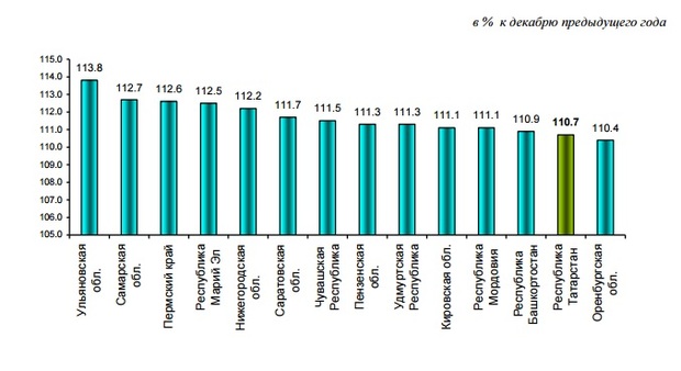 По данным Татарстанстата, инфляция ниже чем в РТ среди регионов ПФО наблюдалась только в Оренбургской области (10,4%). Самая высокая инфляция в декабре наблюдалась в Ульяновской области (13,8%).