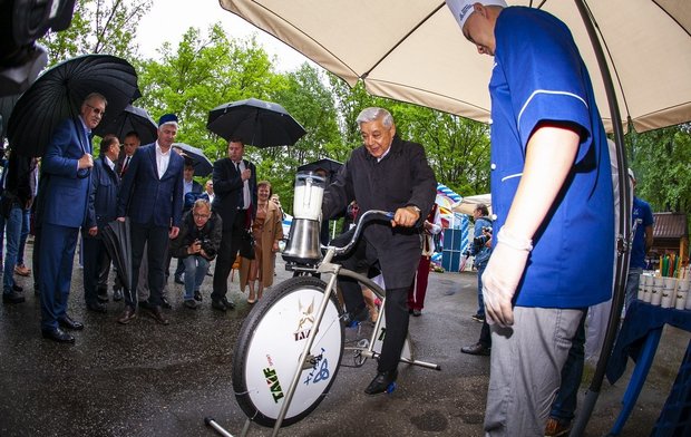 На этом сюрпризы не закончились. Председатель Государственного совета РТ Фарид Мухаметшин попробовал свои силы на так называемом велошейкере — гибриде велосипеда и кухонного блендера, после чего отведал на вкус приготовленный фруктовый коктейль.