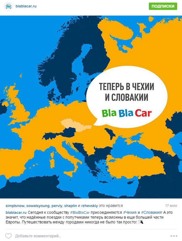 Сервис попутчиков BlaBlaCar вышел на рынок Чехии и Словакии