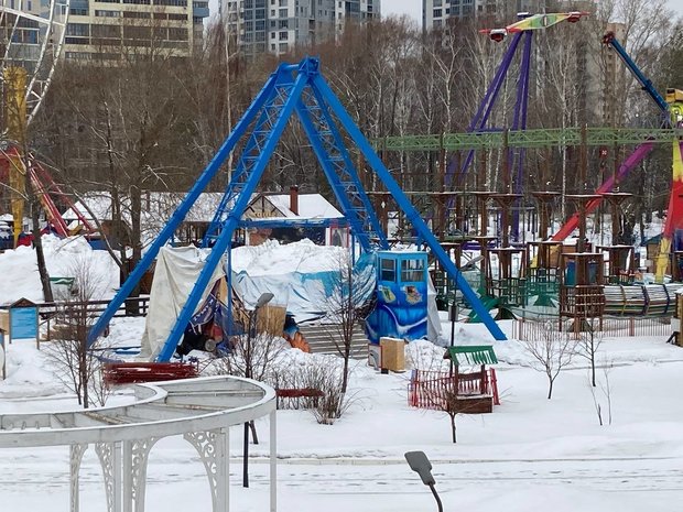 На участке работают кран, погрузчик и автовышка. Рабочие приступили к разбору аттракционов: сидений нет у цепочной карусели и «Летающей тарелки».