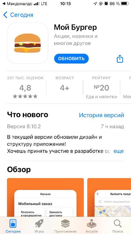 Приложение McDonald’s обновилось и теперь называется «Мой бургер». На стартовой странице пользователям предлагается перейти в App Store и загрузить его.