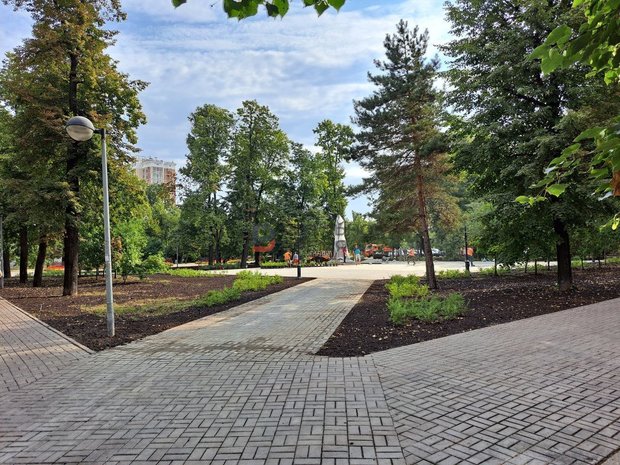 В сквере уложили новую брусчатку. Рабочие высаживают растения вдоль дорожек и на клумбах возле памятника, а также очищают площадь.