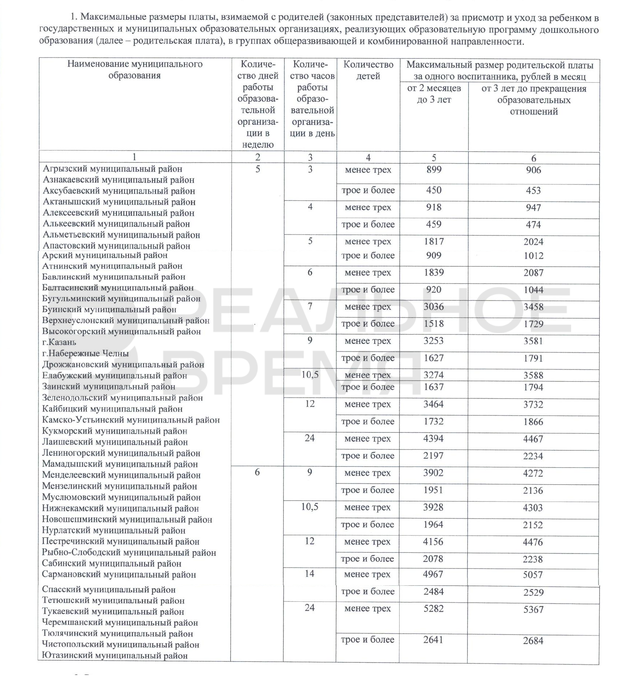 - Кабмин Татарстана утвердил максимальные размеры платы, взимаемой с родителей за присмотр и уход за ребенком в государственных и муниципальных детских садах. Они вступят в силу с 1 января 2023 года.