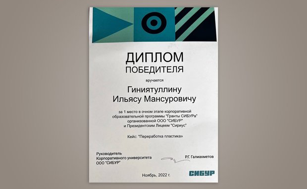 Гиниятуллин Ильяс, учащийся 11 «Б» Сибур-класса лицея N35 города Нижнекамска, стал обладателем диплома за 1-е место в направлении «Химия» с кейсом «Переработка пластика».