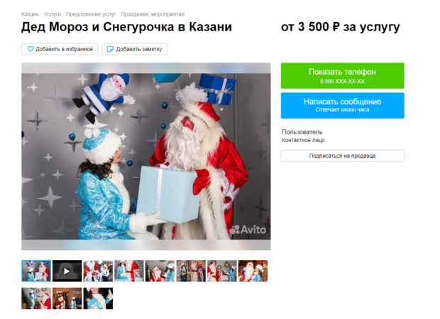 Самый распространенный ценник — 1,5 тысячи рублей. Таких предложений насчитывается уже десятки. Также можно найти Деда Мороза и Снегурочку за 800 и 990 рублей, тысячу рублей, 1,3 тысячи и 2 тысячи.