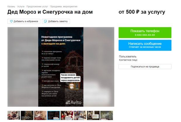На досках объявлений в Казани появились первые предложения по оказанию услуг выезда артистов в образах Деда Мороза и Снегурочки на детский или взрослый праздник. Они обойдутся в среднем в 1,5 тысячи рублей, выяснило «Реальное время».