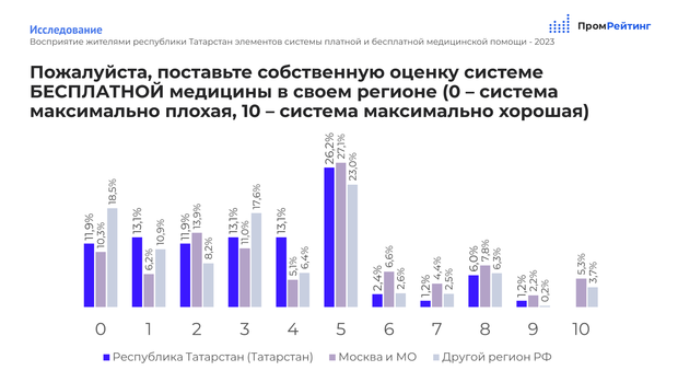 В среднем в Татарстане уровень бесплатной медицины оценивают на 3,4 балла из 10 — это хуже, чем в среднем по России — 3,5. Респонденты единогласно решили, что на максимальный балл система не работает — 10 баллов не поставил никто, тогда как в Москве максимум поставили 5,3% респондентов, в ряде других регионов — 3,7% опрошенных.