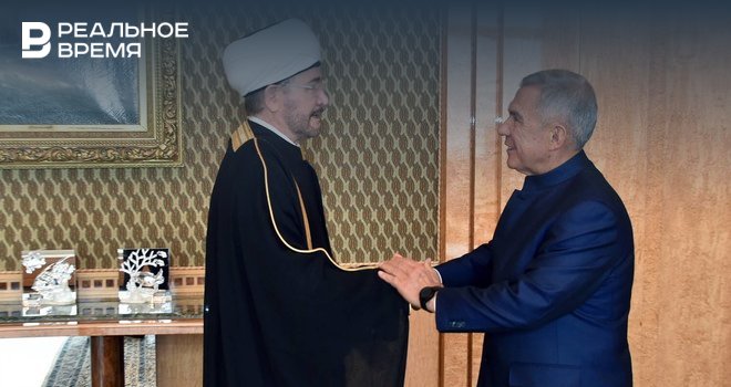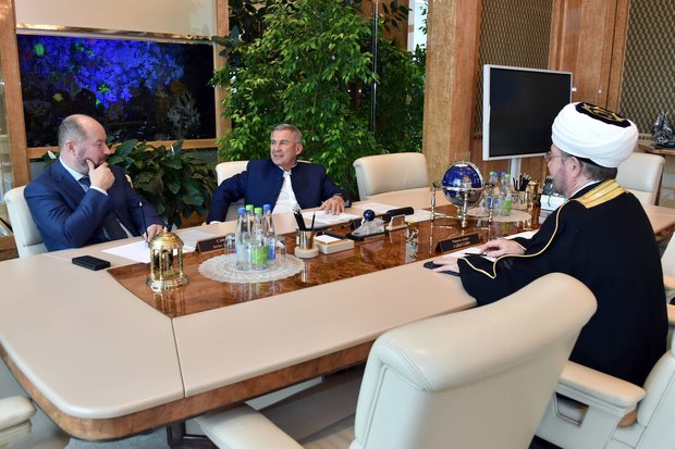 Раис Татарстана Рустам Минниханов встретился с председателем Духовного управления мусульман РФ, председателем Совета муфтиев России Равилем Гайнутдином. Встреча прошла в Доме правительства РТ.