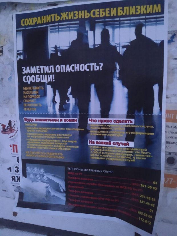 На подъездах казанских домов стали появляться листовки с призывом быть бдительнее, с инструкциями на случай теракта, эвакуации и просто появления в доме подозрительных посетителей с расспросами, а также с телефонами экстренных служб.