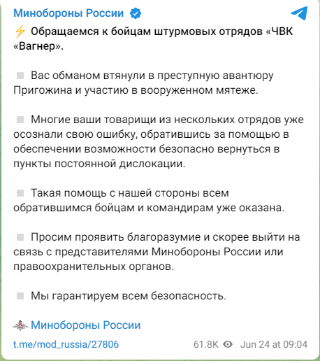 Минобороны России обратилось к бойцам штурмовых отрядов ЧВК «Вагнер». В ведомстве отметили, что их обманом втянули в преступную авантюру Пригожина и участие в вооруженном мятеже.