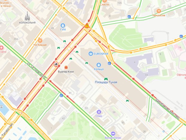 По данным сервиса «Яндекс.Карты», на улице Пушкина пробка наблюдается по двум направлениям, движение затруднено и в Щербаковском переулке. В целом в городе спокойная дорожная ситуация, пробки 3 балла.