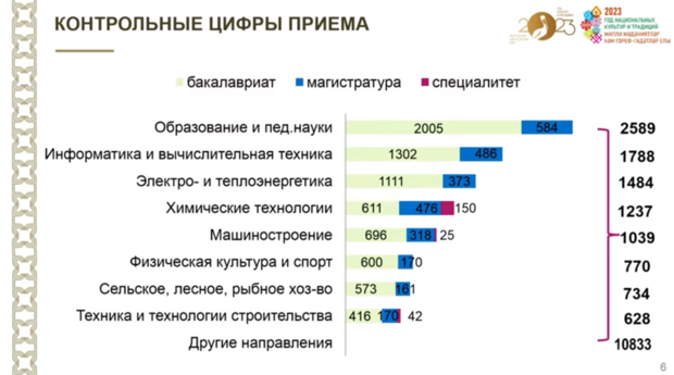 — За последний год увеличение контрольных цифр приема наблюдается как на инженерно-технические, так и естественно-научное направление, такие как ядерная энергетика, история, археология, фармация и архитектура, — рассказал он.