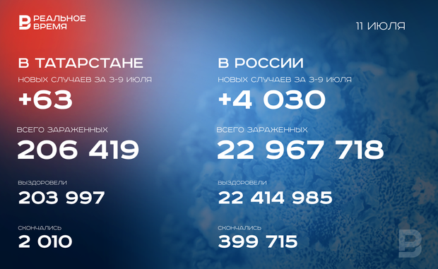 В Татарстане за неделю заболеваемость коронавирусом снизилась на 4,5%. С 3 по 9 июля в республике подтвердилось 63 случая COVID-19, что на три меньше, чем за предыдущие семь дней, выяснило «Реальное время», изучив данные федерального оперштаба по борьбе с распространением инфекции.