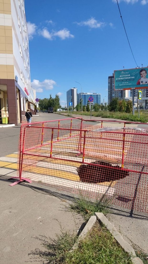Асфальт провалился на месте пешеходного перехода. Сейчас территория частично огорожена.