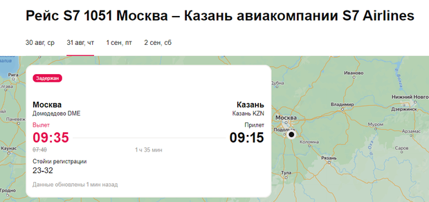 Один из самолетов должен был вылететь в Казань в 7.40. Согласно информации сервиса, рейс авиакомпании S7 Airlines покинет столичный аэропорт на два часа позже.
