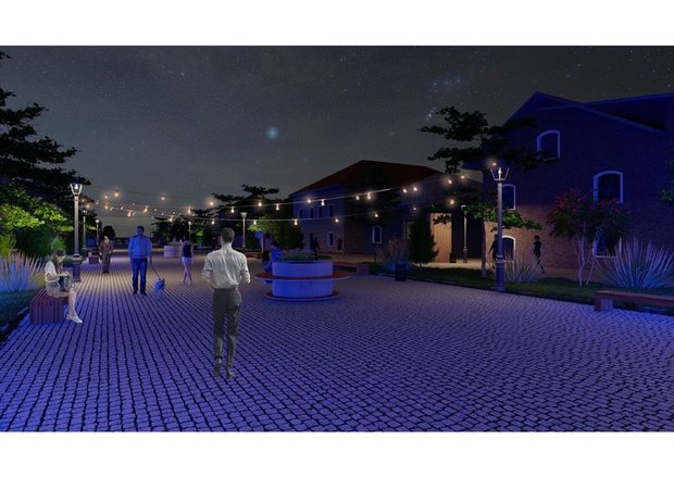 Одной из точек притяжения станет пешеходный светодинамический фонтан с зонами отдыха в виде теневых навесов, скамеек и зеленых насаждений. Пешеходная улица будет представлять собой основной променад с зонами отдыха. По задумке архитекторов, комплекс этих мероприятий позволит улучшить облик города.
