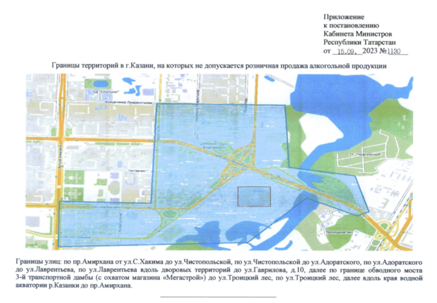 Постановлением республиканского правительства определены границы территорий, где 17 сентября запрещается розничная продажа алкоголя: по проспекту Амирхана, от ул. Сибгата Хакима до ул. Чистопольской, по ул. Чистопольской до ул. Адоратского, по ул. Адоратского до ул. Лаврентьева, по ул. Лаврентьева вдоль дворовых территорий до ул. Гаврилова, 10, далее по границе обводного моста Третьей транспортной дамбы до ул. Троицкий Лес, а затем вдоль края водной акватории Казанки до проспекта Амирхана.