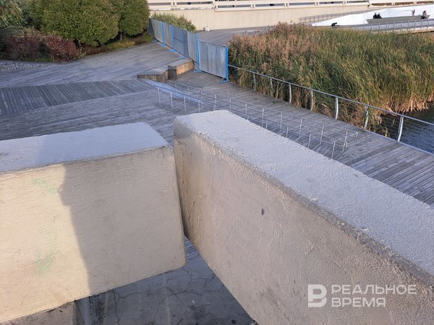 — Из-за риска обрушения подпорной стены (проблема существует давно, но сейчас она достигла кризисной отметки) мы на время ограничили доступ к участку набережной от ул. Марджани до ул. Салимжанова. Вернуться на набережную можно, если пройти через площадь у театра Камала. Помните, что это нужно для вашей безопасности, — гласит с мая 2022 года предупреждение на баннере, установленном на площади перед театром Камала.
