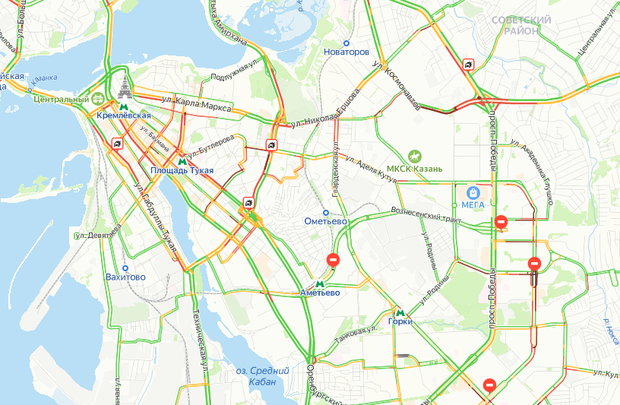 Заторы также наблюдаются в центре города и в Советском районе города. Трудности водители испытывают в районе Мамадышского тракта и на улице Юлиуса Фучика.