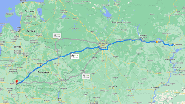 Сейчас из Казани до Бреста на машине можно добраться примерно за 23 часа.