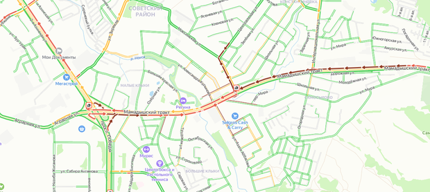 Сейчас на Мамадышском тракте наблюдается пятикилометровый затор в сторону улицы Аграрной. В обратном направлении пробка растянулась более чем на 2 километра.
