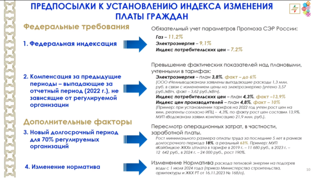 Предпосылок, по которым тарифы на коммунальные услуги в 2024 году станут выше, несколько. Среди них глава госкомитета по тарифам Александр Груничев назвал федеральную индексацию тарифов на газ (11,2%) и электроэнергию (9,1%), индекс потребительских цен (7,2%), а также необходимость увеличивать зарплаты сотрудников, занятых в этой сфере.